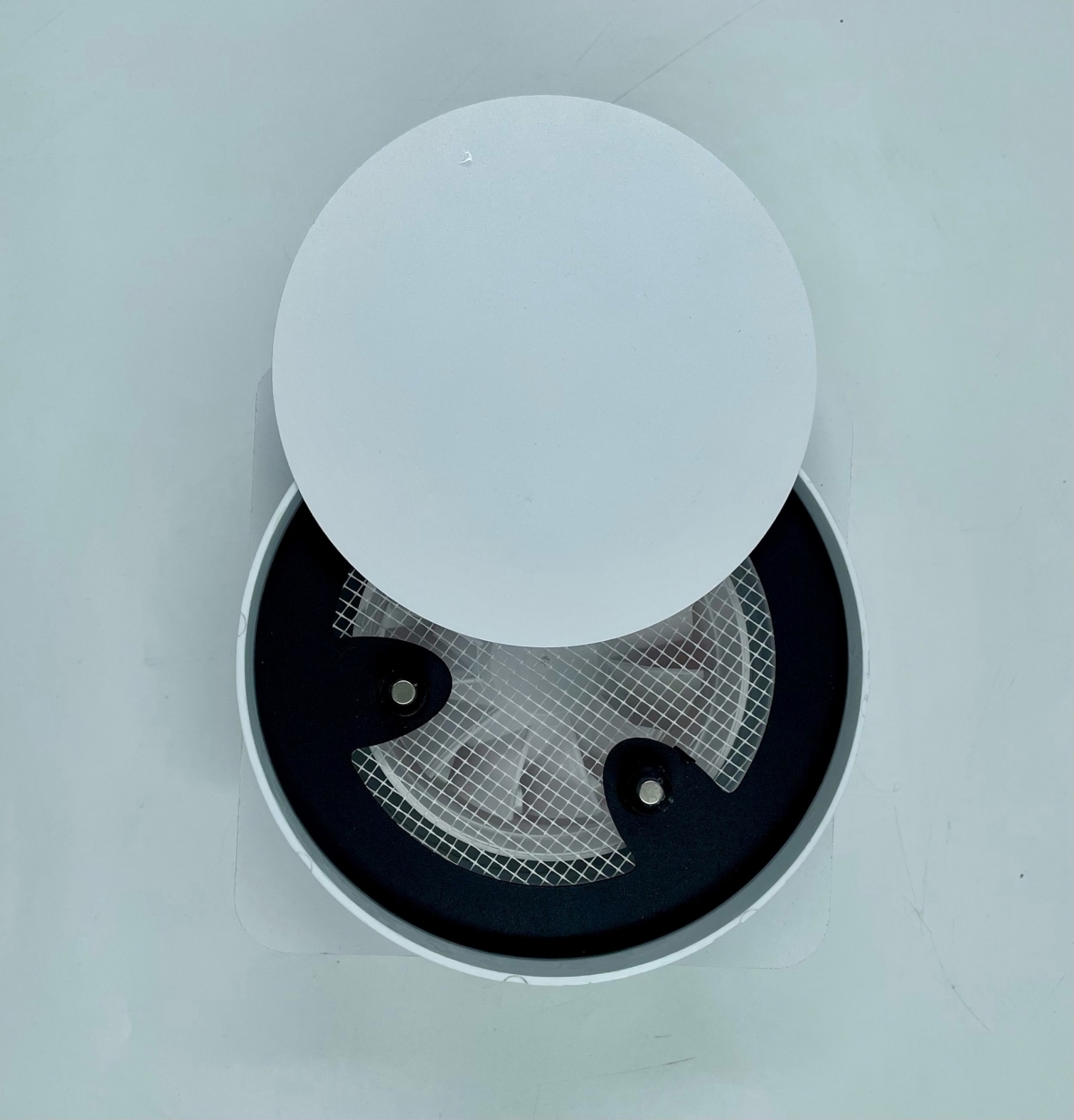 - Решетки сделаны из высококачественного пластика и стали и покрашены в белый матовый цвет муар, который идеально сочетается с цветом и текстурой полотна потолка. Центральный диск держится на неодимовых магнитах.