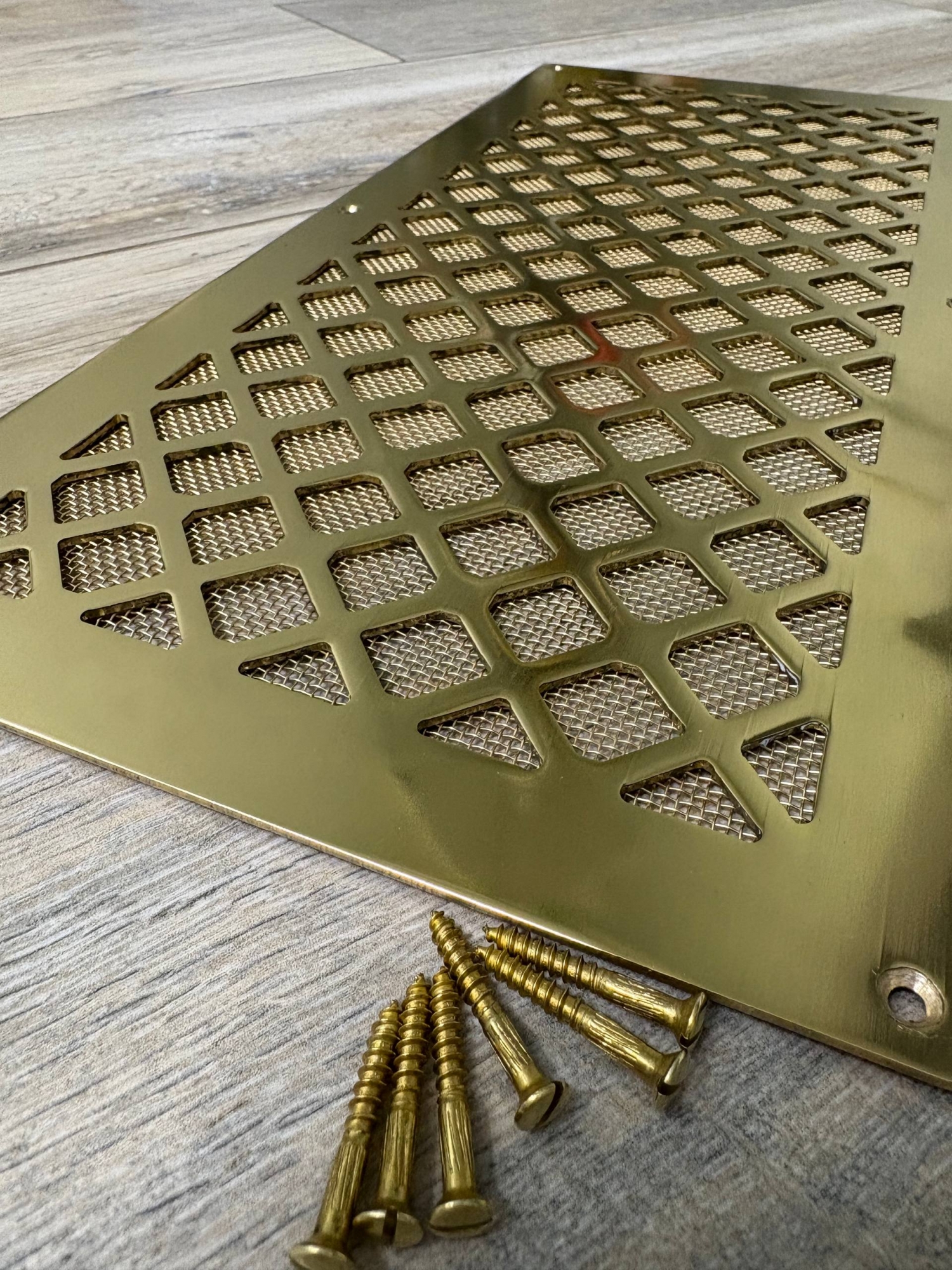 Вентиляционная решётка латунная полированная с сеточкой и шурупами ЛР18 400х200